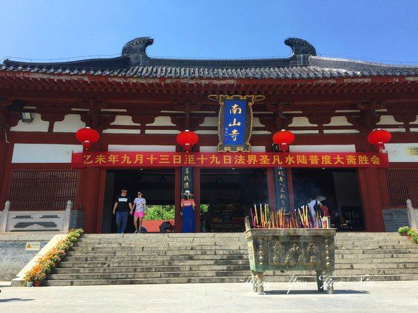 南山 寺:是一座仿古盛唐风格的大型寺院,整体气势恢宏,为华南地区规模最大的寺庙。寺院建有仁王殿、大雄宝殿、东西配殿、钟鼓楼、转轮藏等,分别供奉门神哼哈二将、释迦牟尼佛、阿弥陀佛和药师佛、十六罗汉。