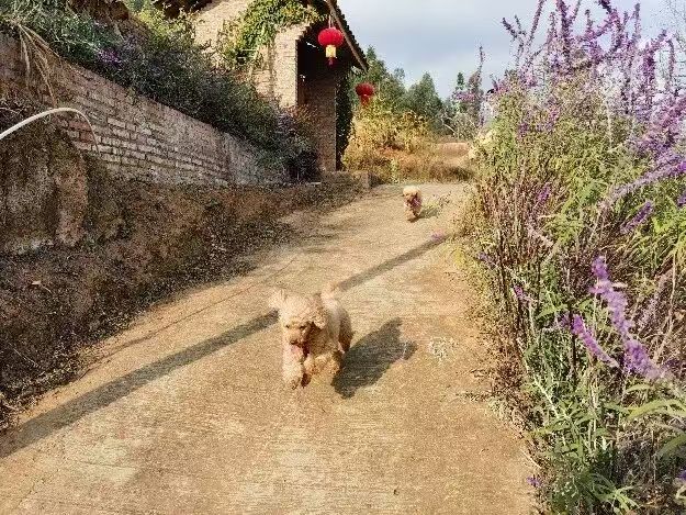 因为要带着家中的两只泰迪一同出行,我们挑选了一家名叫“花间映月”的民宿。两只泰迪中姐姐叫康妮Canny,是2014年底刚满月时买来送给儿子的礼物。康妮虽然已经十岁多了(相当于人类65岁左右),胃口和体力都还不错,我们觉得她就像一个四十多岁的辣妈。弟弟叫朱尼尔Junior,是黄董事长的女儿在2018年春节后送给我们的,到家时才出生两个月,刚刚治好“细小”,瘦瘦弱弱的样子,叫得很哀切。康妮对家里新来的弟弟不太爱搭理,我们担心朱尼尔孤独和受寒,晚上就把他放在卧室床边随手可及的一个小笼子里。这只小可怜在洪姐照顾下健康成长,如今已是聪明伶俐的青壮年了。